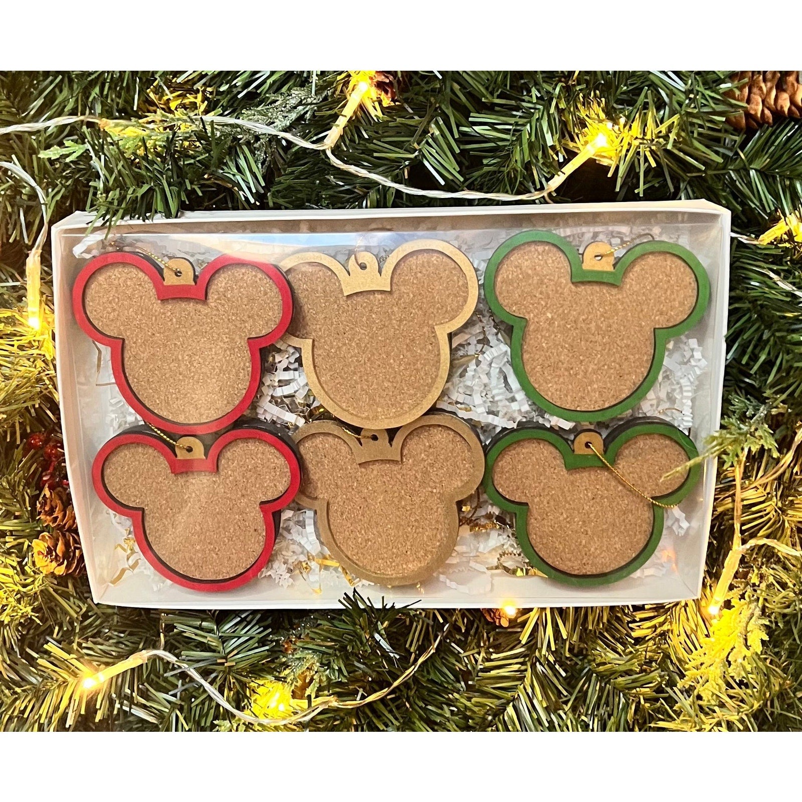 Custom crafted Disney Pin Board Ornaments. Made from the same material as our standard pin boards. Includes 6 pieces total gift packaged as pictured. Each board holds one pin. Decorate your tree with your favorite Disney pins!